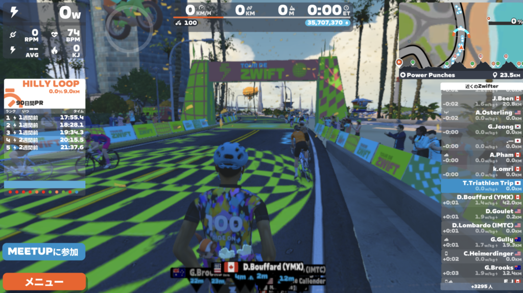 - 元の画面に戻ってスタートを待つ 画面左上にワークアウトのメニューが表示されていることを確認したら、そのままペダルを回してミートアップのスタート時間を待ちます。