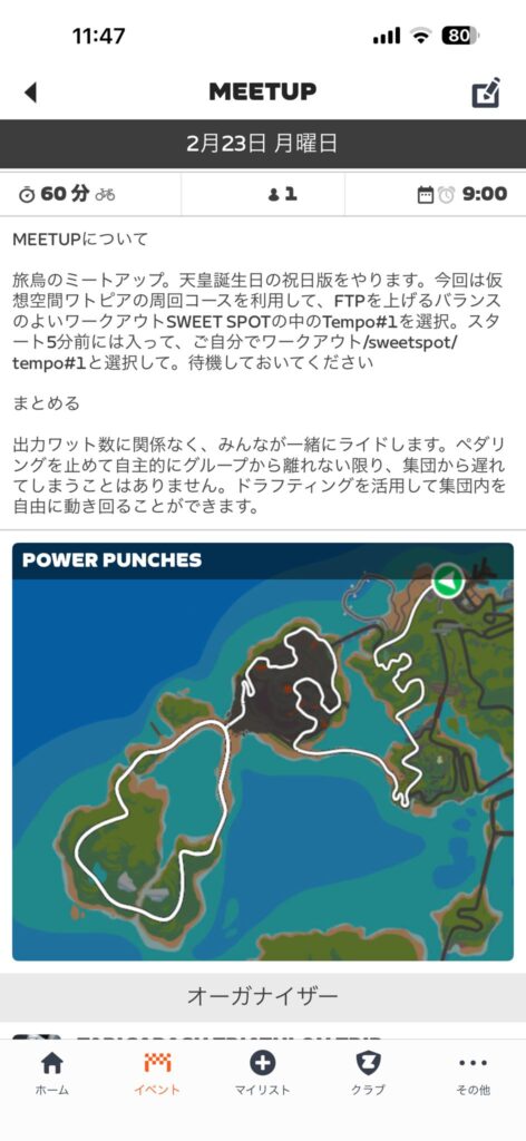 まず旅烏のミートアップでワークアウトをやる場合は、そのことを記述してZwift Companion アプリに招待いたします。旅烏が招待したイベント欄には、ルートに加えて一緒にやるワークアウトの名前を指定します。旅烏が招待するのは、イベント開始日の2日前から前日です。まずはイベント欄をチェックして内容を確認してください。